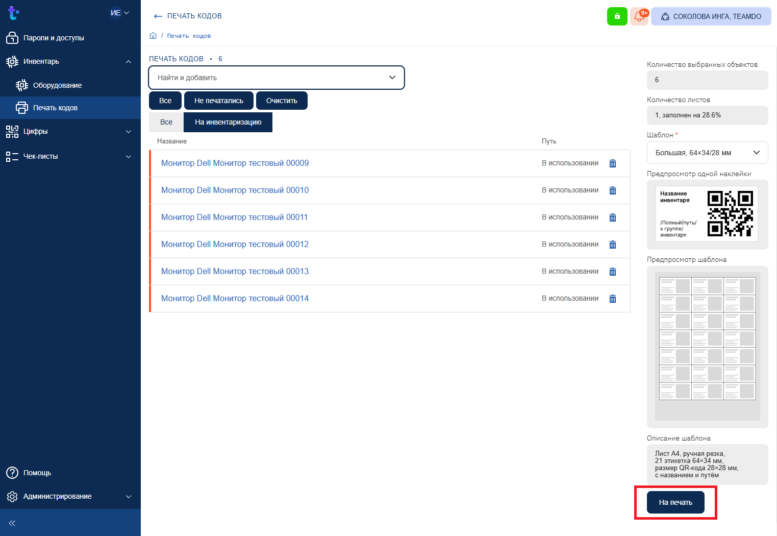 Перейдите в раздел Инвентарь → Печать кодов.