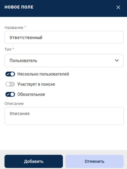 В схемы полей добавлен тип поля «Пользователь»: позволяет в дополнительных полях выбрать одного или нескольких пользователей. Поле можно сделать обязательным к заполнению.