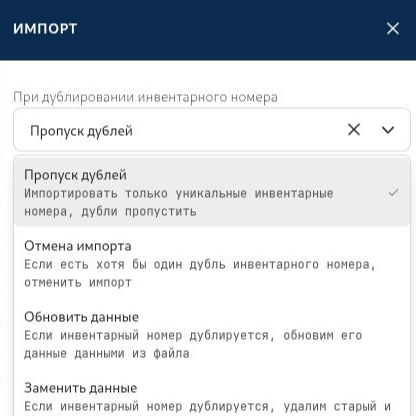 При обнаружении дублей (по инвентарному номеру) можно выбрать как будет приниматься решение: